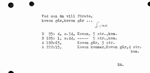 //// Vad man än vill företa, kovan går,kovan går ... //// J //// B 95: 4, s.34t Kovan, 5 str.,kom. //// B 105: 1, s.44, •--- 5 str. ,kom. //// A 190:63, Kovan går, 3 str. //// A 222:15, Kovan kommer,Kovan går,4 str, //// kom. //// ra. ////