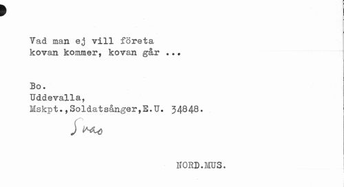 //// p //// Vad man ej vill företa kovan kommer, kovan går ..? //// Bo. //// Uddevalla, //// Mskpt.,Soldatsånger,E.U. 34848. //// j ^ö //// NORD.MUS. ////