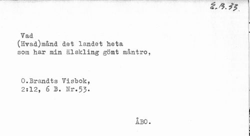 //// _ I ¦ //// Vad //// (Hvad)månd det landet heta //// som har min älskling gömt måntro, //// O.Brandts Visbok, 2:12, 6 3. Nr.53. //// i //// ¦ //// i s //// ÅBO. //// ¦ //// J I I //// I ////