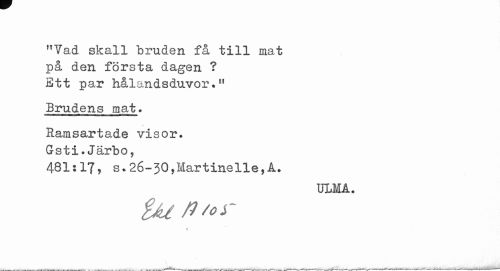 //// "Yad skall bruden få till mat på den första dagen ? Ett par hålandsduvor.11 //// Brudens mat. //// Ramsartade visor. Gsti.Järbo, //// 481:17, s.26-30,Martinelie,A. //// ULM A, //// < ////