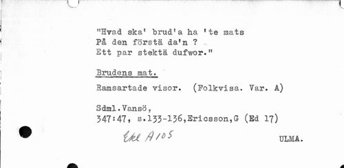 //// r,Hvad skaf brud1 a ha 1 te mats På den första dafn ? Ett par stekta dufwor." //// Brudens mat» //// Samsartade visor. (Folkvisa. Tar. A) Sdml.Tansö, //// 347:47, s. 133-13.6*Ericsson,G (Ed 17) //// ® Ul/)'»s ULM A. ////
