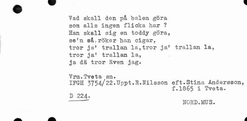 //// Tad skall den på balen göra //// som alls ingen flicka har ? //// Han skall sig en toddy göra, //// se!n sårröker han cigar, //// tror ja! trallan la,tror ja1 trallan la, //// tror jaf trallan la, //// ja dä tror även jag. //// Yrm.Tveta sn. //// IFGH 3754/22.Uppt.R.Nilsson eft.Stina Andersson, //// f.1865 i Tveta. //// D 224. //// -HORD. MUS. ////
