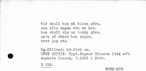 //// 7 ad skall han på balen göra, som alls ingen vän nu har, han skall sig en toddy göra, sefn så röker han cigar, tror jag etc. //// 7g.Kållands hd.Strö sn. //// •IPGH 4957/2. Uppt.Ragnar Hilsson 1944 eft. Augusta Janson, f.1868 i Strö. //// D 224- //// ' HORD. MS. ////