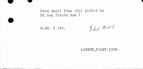 //// Hvad skall frun till }ifvet ha På den första dan ? //// A //// S. 68. 5 Str. iyjzJ //// LARS0ir,F0LK7.1908. ////