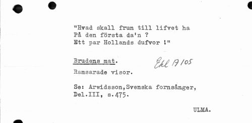 //// "Hvad skall frun till lifvet ha //// På den första dafn ? //// Ett par Hollands dufvor t11 //// % • é Xr //// Brudens mat. Q /of //// Ramsarade visor. //// ? //// Se: Arwidsson,Svenska fornsånger, //// Del.III, s.475. //// ULMÅ. ////