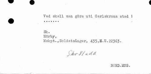 //// Vad skall man göra uti Carlskrona stad ! Sk. //// Hörby, //// Mskpt.,Soldatsånger, 435?E.U.22363. //// yU //* //// NO ED. MUS. ////