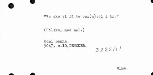 //// !fVa ska vi få te bar(n)söl i år.lf (Polska, med mel») //// c //// Sdml.Länna, 9047, s.lO.DENCKER. //// ULMÅ. ////