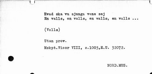 //// Hvad ska tu sjunga vene sej //// En Talls, en valls, en valls, en valls ... //// (Valls) Utan prov. //// Mskpt.Visor VIII, s.1003,E.U. 32072. //// HORD.MUS. ////