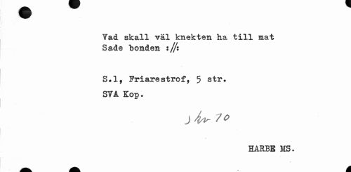 //// Yad skall väl knekten ha till mat Sade bonden ://: //// S#lf Friarestrof, 5 str* STA Kop. //// J 4*- 7° //// HARBE MS. ////