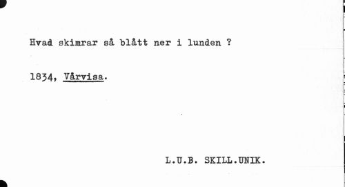 //// I ¦ //// Hvad skimrar så "blått ner i lunden ? //// 1834, Våryjsa. = //// ¦ //// m //// I //// % ¦ L.U.B. SKILL.TOIK. //// k ////