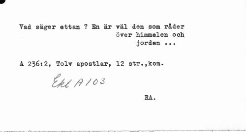 //// Yad säger ettan ? En är väl den som råder //// över himmelen och jorden ... //// A 236:2, Tolv apostlar, 12 str.,kom» //// ii//?/** //// Så. ////