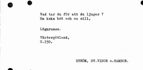 //// Vad tar du för att du ljuger ? En ksJcE b. ro och en sill. //// Lögnramsa. Västergötland, //// 3.230* //// STRÖM, SV.VISOR o.RAMSOR. ////