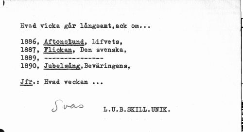 //// Hvad vicka går långsamt,ack om... //// 1886, Aftonstund, Lifvets, //// 1887, Flickan» Den svenska, //// 1889 ,--- //// 1890, Jubelsång»Beväringens? Jfr.: Hvad veckan ... //// c) ' ^ L. U. B. SKILL. UNTIK. j //// t i ////