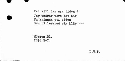 //// Vad vill den nya tiden ? //// • Jag undarar vart det "bär //// Nu kvinnan uti siden Och pärleskrud sig klär —- //// Mörrum,Bl. //// 2676:5-7* //// L.tt.F. ////