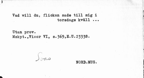 //// • -Vi;' S • •' o , 'å^Äil //// ¦¦ //// m //// Vad vill du, flickan sade till mig i //// torsdags kväll .•. //// Utan prov. //// Mskpt.fVisor VI, s.569*E.IF.23538. //// m //// J „ //// HORD.MUS. I //// \ //// P ¦ //// f S ////