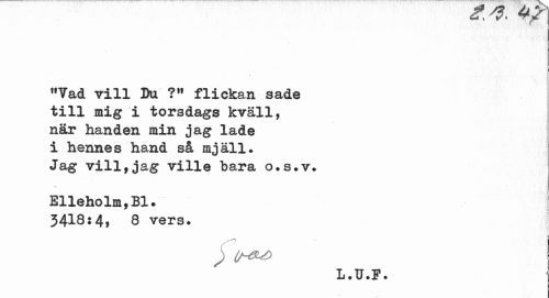 //// Ca , ?» ^ y //// »Yad vill Du ?lf flickan sade till mig i torsdags kväll, när handen min jag lade i hennes hand så mjäll. Jag vill,jag ville bara o.s.v. //// Elieholm,Bl. //// 3418:4, 8 vers. ! //// L.U.F. ////