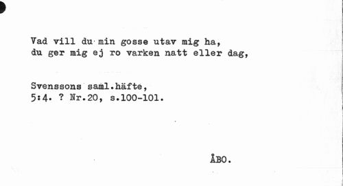 //// Vad vill du- min gosse utav mig ha, du ger mig ej ro varken natt eller dag, //// Svenssons saml. häfte, 5:4* ? Hr.20, s.100-101. //// i i //// ÅBO. //// I //// i i i ////
