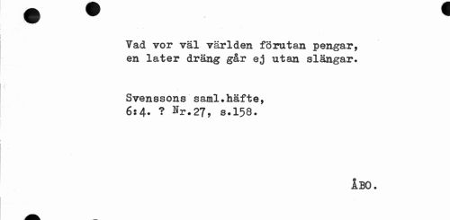 //// Yad vor väl världen förutan pengar, en låter dräng går ej utan slängar. //// Svenssons saml.häfte, 6*4. ? Hr.27, s.158. //// ÅBO. ////