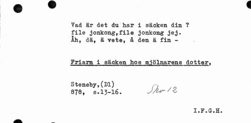 //// Vad är det du har i säcken din ? file jonkong,file jonkong jej. ih. dä. ä vete, å den ä fin - //// Friarn i säcken hos m.jSlnarens dotter, //// Steneby,(Dl) , //// 878, s.13-16. JA*-' //// X »F • G-• H# ////