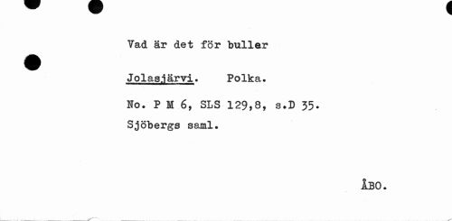 //// Vad är det för buller //// Jolasjärvl» Polka» //// lo. P M 6, SLS 129,8, s.D 35» Sjöbergs saral» //// ÅBO. ////