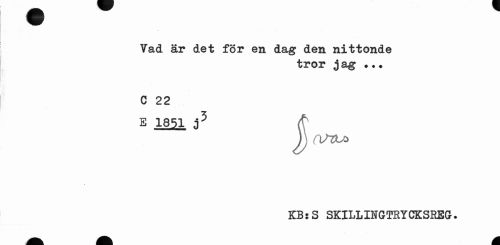 //// Vad är det för en dag den nittonde //// tror jag ... //// C 22 //// S 1851 j5 //// )\ an //// KBsS SKILLINGTRYCKSREG. ////