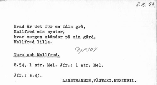 //// 6^ 7 //// Hvad är det för en fåla grå, Mallfred min syster, hvar morgon ståndar på min gård, Mallfred lilla. //// Qf/^JO? //// Ture och MalIfred. //// S.54» 1 str# Mel. Jfr.s 1 str. Mel. //// Jfr.: s»43* //// L ANDTMANSON, TAS TE EG. MtJSIKBIL. ////