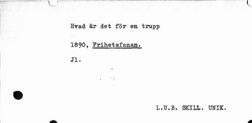 //// Hvad är det for en trupp //// 1890, Frihetsfanan» Jl. //// % //// i ' - //// L.U.B. SKILL. UNIK. ////
