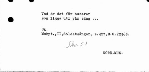 //// Vad är det för husarer ^^ som ligga uti vår säng //// Sk. //// Mskpt.,11,Soldatsånger, s.427,E.U.22363. //// yj^ $- > //// NORD.MUS. ////