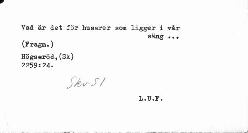 //// Vad är det för husarer som ligger i vår //// säng • • • //// (Fragm.) Högseröd,(Sk) //// 2259^24- //// J/é^JV ////