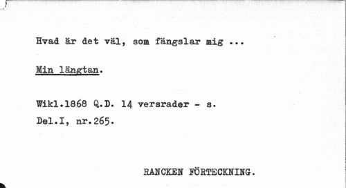 //// 7 //// Hvad är det väl, som fängslar mig ... Min längtan. //// Wikl.1868 Q.3). 14 versrader - s. //// Del.I, nr.265» //// RÅNCKEN POSTECKNING. ////
