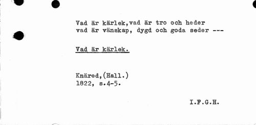 //// Vad är kärlek,vad är tro och heder //// • vad är vänskap, dygd och goda seder--- //// ) //// Vad är kärlek* Knäred,(Hall.) //// 1822, s.4-5» //// I.F.G.H. ////