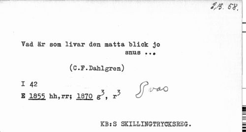 //// Yad är som livar den matta blick jo //// snus • ? + //// (C.F.Dahlgren) //// i //// B 1855 hh,rr5 1870 rp //// KB:S SKILLINGTRYCKSRSG. | ////