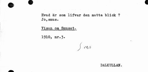 //// Hvad är som lifvar den matta blick ? Jo,snus. //// Visan om Snuset* 1910, nr.3. //// f Vit/? //// DALKULLAN. ////