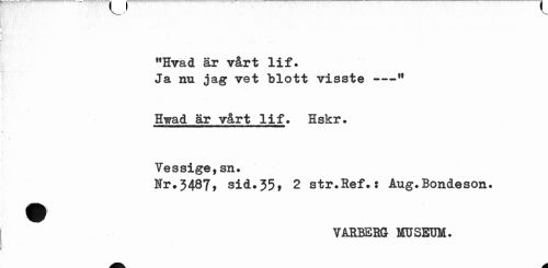 //// «Hvad är vårt lif. //// Ja nu jag vet blott visste ---n //// Hwad är vårt lif. Hskr. Vessige,sn. //// Hr.3487, sid.351 2 str.Ref.: Åug.Bondeson. //// YÅRBERG MUSEUM. ////