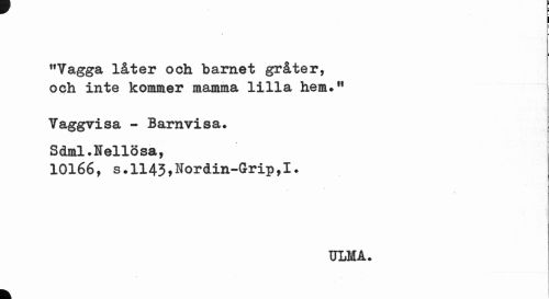//// • L //// "Vagga låter och barnet gråter, och inte kommer mamma lilla hem?,f //// Vaggvisa - Barnvisa. Sdml.Nellösa, //// 10166, s.1143,Nordin-Grip,I. //// ULM A. //// k I ////