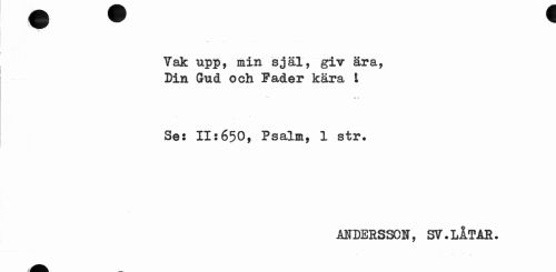 //// Vak upp, min själ, giv ära, Din Gud och Fader kära t //// Se» 11:650, Psalm, 1 str. //// ANDERSSON, SV. LÅT AR. ////