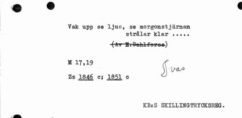 //// Vak upp se ljus, se morgonstjärnan //// strålar klar ... //// M 17,19 (C //// Zz 1846 cj 1851 o < //// KBsS SKILLINGTRYCKSREG. ////