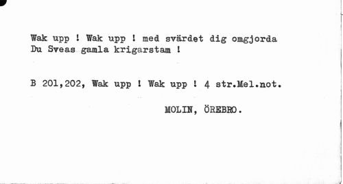 //// .1 •i //// Wak upp i Wak upp l med svärdet dig omgjorda Du Sveas gamla krigarstam t //// B 201,202, Wak upp i Wak upp 1 4 str.Mel.not. //// MOLIN, ÖREBRO. //// ... ___ ___ . • . . • • * ////