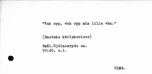 //// f,Vak opp, Tak opp min lilla vän." //// (Enstaka kärleksvisor) //// Smål.Hjälmsery&s sn. 92:40, s.l. //// jtk) //// ULM A. ////