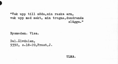 //// f //// MVak upp till möda,min raska ara, vak upp med makt, min trogna,dundrande //// slägga." //// Bysmeden. Visa» //// Dal.Älvdalen, //// 9392, s.18-20,Prost,J. //// ULMA. ////