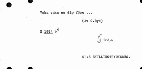 //// Vaka vaka se dig före ... //// (Av G.Ryd) //// E 1884 b4 //// y<lrcu> //// KBsS SK ILL ISfGTRY CKSREG. ////