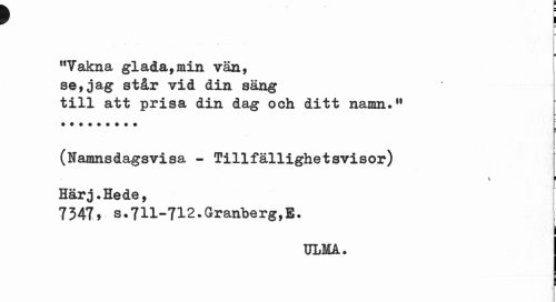//// t j //// I f //// "Vakna glada,min vän, //// se,jag står vid din säng //// till att prisa din dag och ditt namn.11 //// (Hamnsdagsvisa - Tillfällighetsvisor) //// ! //// Härj.Hede, //// 7347» s.711-712.Granberg,E. //// ULMA. | //// i ////