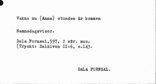 //// Vakna nu (Anna) stunden är kommen //// Dala Fomsal,597> 2 str. mus» //// (Tryckt: Dalälven 11:6, s.143. //// DALA FOKHSAL. ////