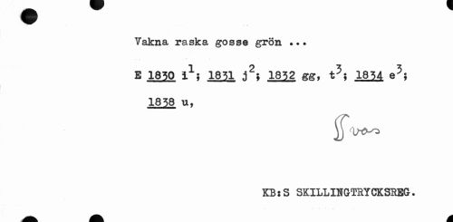 //// Vakna raska gosse grön ... //// E 1850 i1; 1821 j2; 1852 gg, t5; 1834 e5? 1858 u, //// KBsS SKILLINGTHYCKSREG. ////