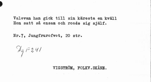 //// t //// I //// Valevan han gick till sin käresta en kväll Hon satt så ensam och roaåe sig själf. //// i //// Nr»7, Jungf ru.ro f ve t, 20 str. //// % i-im //// » //// VIGSTRÖM, FOLKV.SKÅNE. //// > • - . -. ™ ////
