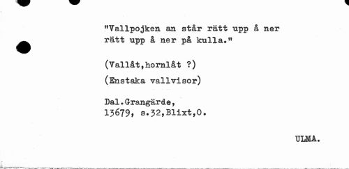 //// "Tallpojken an står rätt upp å ner ^^ rätt upp å ner på kulla." //// (Yallåt,hornlåt ?) (Enstaka vallvisor) //// 13679, s?32,Blixt,0. //// ULMA. ////