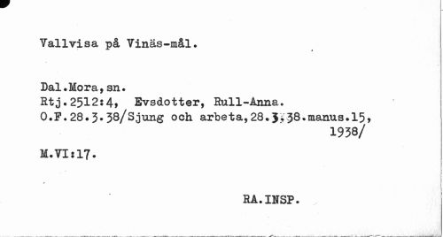 //// Vallvisa på Vinas-mål. Dal. Mora, sn. //// Etj.2512:4, Evsdotter, Hull-Anna. O.F.28»3.38/Sjung och arbe t a, 28 • J; 38.manus.15» //// 1938/ //// M.VI:17. //// r //// RA.INSP. ////