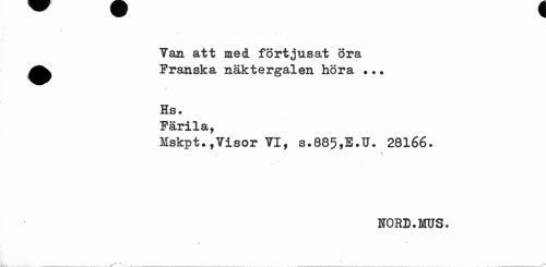 //// Van att med förtjusat öra //// Franska näktergalen höra • • ? //// *» //// Hs. //// Färila, //// Mskpt.,Visor VI, s.885,E.U. 28166. //// U0RD.MU3. //// « * ////