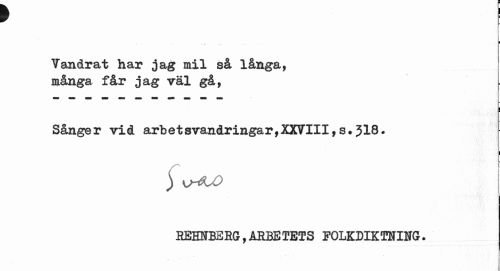 //// ¥ l //// T //// I //// Vandrat har jag mil så långa, många får jag väl gå, //// Sånger vid arbetsvandringar,XXVIII, s* 318. //// 1 //// REHNB3RG,ARBE TETS FOLKDIKTNING. ////