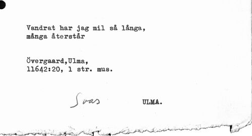 //// T //// Vandrat har jag mil så långa, många återstår //// r //// f //// I //// öve rgaard .Ulma. 11642:20, 1 str. mus. //// ^J ULM A. ////